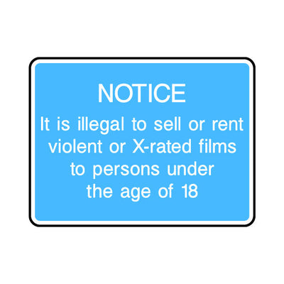 The Notice - It Is Illegal To Sell Or Rent Violent Or X-rated Films To Persons Under The Age Of 18 sign falls under the Information Signs category. This sign is commonly used in various settings, including workplaces, schools, and public spaces, to enhance safety and compliance. This sign compl