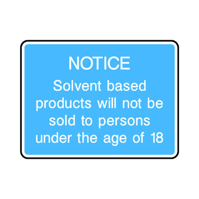 The Notice - Solvent Based Products Will Not Be Sold To Persons Under The Age Of 18 sign falls under the Information Signs category. This sign is commonly used in various settings, including workplaces, schools, and public spaces, to enhance safety and compliance. This sign complies with UK hea