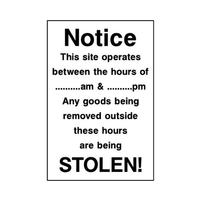 The Notice - This Site Operates Between The Hours Of… sign falls under the Construction category. This sign is commonly used in various settings, including workplaces, schools, and public spaces, to enhance safety and compliance. This sign complies with UK health and safety standards, including BS ISO 7010, ensuring that it meets legal requirements for safety signage. By displaying this sign, you contribute to creating a safer environment while adhering to regulations. At One Printer, we make it easy to order the exact product you need. You can select from a range of materials and finishing options to suit your specific requirements. Our available materials include 1mm PVC, 3mm Foamex, 3mm Dibond, self-adhesive vinyl, anti-slip floor graphics, and removable magnetic. Finishing options include 3M double-sided tape or drill holes for easy installation. With One Printer, you can be confident that your signage meets the highest standards of safety, durability, and customisation, all backed by our expert customer support team. H&S Sign Product Code: CN129.