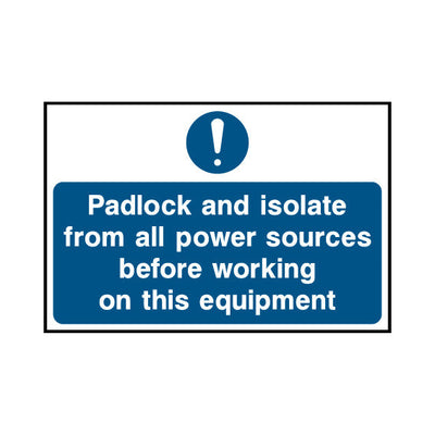 The Padlock And Isolate From All Power Sources Before Working… sign falls under the Lockout Signs category. This sign is commonly used in various settings, including workplaces, schools, and public spaces, to enhance safety and compliance. This sign complies with UK health and safety standards,