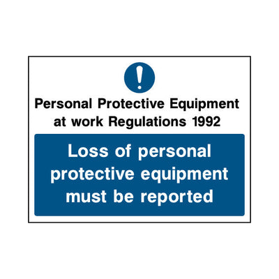 The Personal Protective Equipment At Work Regs 92 - Loss Of PPE sign falls under the Protective Clothing category. This sign is commonly used in various settings, including workplaces, schools, and public spaces, to enhance safety and compliance. This sign complies with UK health and safety stan