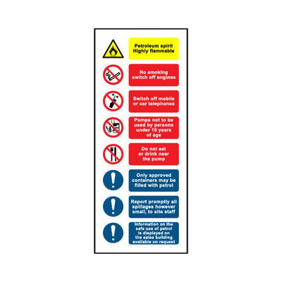 The Petroleum Spirit - Highly Flammable - No Smoking - Switch Off Phones - Only Approved Containers sign falls under the Multi Purpose category. Essential for hospitals, schools, and public spaces to enforce smoke-free policies and comply with the Health Act 2006. This sign complies with UK heal