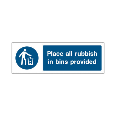 The Place All Rubbish In Bins Provided sign falls under the Machinery & General category. This sign is commonly used in various settings, including workplaces, schools, and public spaces, to enhance safety and compliance. This sign complies with UK health and safety standards, including BS I