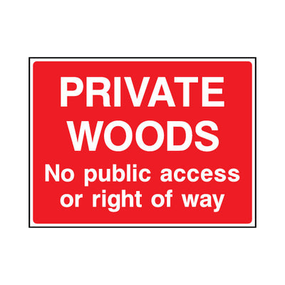 The Private Woods - No Public Access Or Right Of Way sign falls under the Countryside & Agriculture category. This sign is commonly used in various settings, including workplaces, schools, and public spaces, to enhance safety and compliance. This sign complies with UK health and safety stand