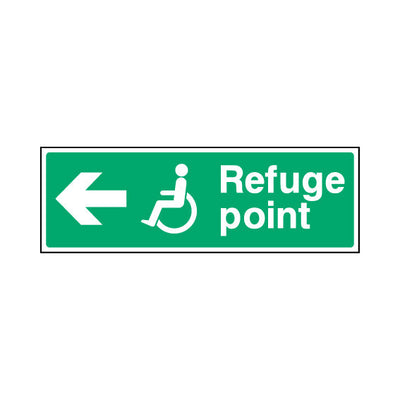 The Refuge Point & Disabled Icon - Arrow Left sign falls under the Emergency Escape category. This sign is commonly used in various settings, including workplaces, schools, and public spaces, to enhance safety and compliance. This sign complies with UK health and safety standards, including