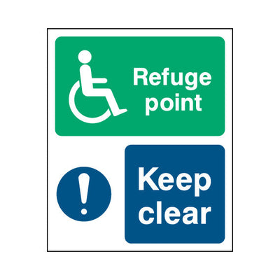 The Refuge Point - Keep Clear sign falls under the Emergency Escape category. This sign is commonly used in various settings, including workplaces, schools, and public spaces, to enhance safety and compliance. This sign complies with UK health and safety standards, including BS ISO 7010, ensurin