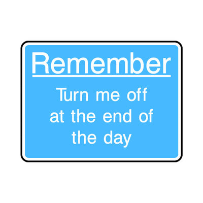 The Remember - Turn Me Off At The End Of The Day sign falls under the Information Signs category. This sign is commonly used in various settings, including workplaces, schools, and public spaces, to enhance safety and compliance. This sign complies with UK health and safety standards, including