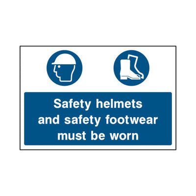 The Safety Helmets And Safety Footwear Must Be Worn sign falls under the Construction category. This sign is commonly used in various settings, including workplaces, schools, and public spaces, to enhance safety and compliance. This sign complies with UK health and safety standards, including BS