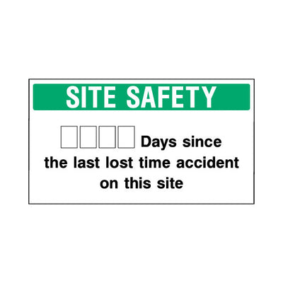 The Site Safety - Days Since The Last Lost Time Accident On This Site sign falls under the Construction category. This sign is commonly used in various settings, including workplaces, schools, and public spaces, to enhance safety and compliance. This sign complies with UK health and safety stand