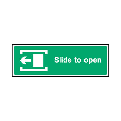 The Slide To Open & Icon Left sign falls under the Emergency Escape category. This sign is commonly used in various settings, including workplaces, schools, and public spaces, to enhance safety and compliance. This sign complies with UK health and safety standards, including BS ISO 7010, ens