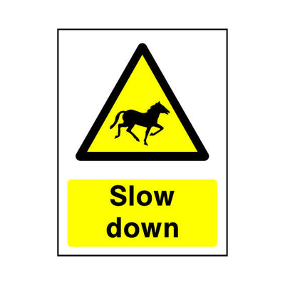 The Slow Down - Horse Symbol sign falls under the Countryside & Agriculture category. This sign is commonly used in various settings, including workplaces, schools, and public spaces, to enhance safety and compliance. This sign complies with UK health and safety standards, including BS ISO 7