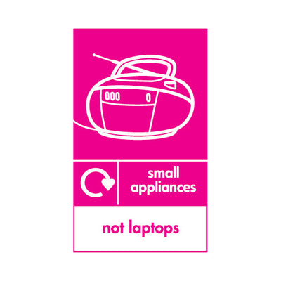 The Small Appliances Recycling Icon - Not Laptops V4 sign falls under the Electrical Recycling category. This sign is commonly used in various settings, including workplaces, schools, and public spaces, to enhance safety and compliance. This sign complies with UK health and safety standards, inc