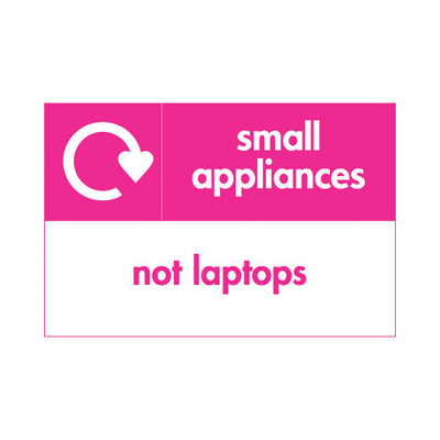 The Small Appliances Recycling - Not Laptops sign falls under the Electrical Recycling category. This sign is commonly used in various settings, including workplaces, schools, and public spaces, to enhance safety and compliance. This sign complies with UK health and safety standards, including B