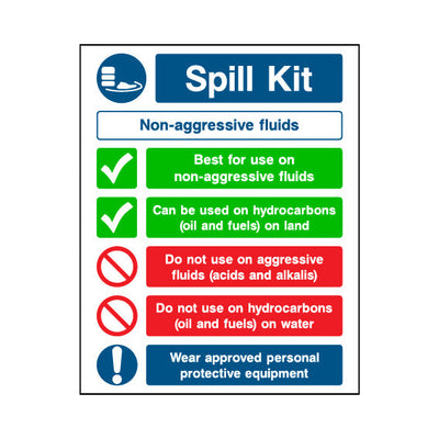 The Spill Kit - Non-aggressive Fluids Info sign falls under the Garage Signs category. This sign is commonly used in various settings, including workplaces, schools, and public spaces, to enhance safety and compliance. This sign complies with UK health and safety standards, including BS ISO 7010