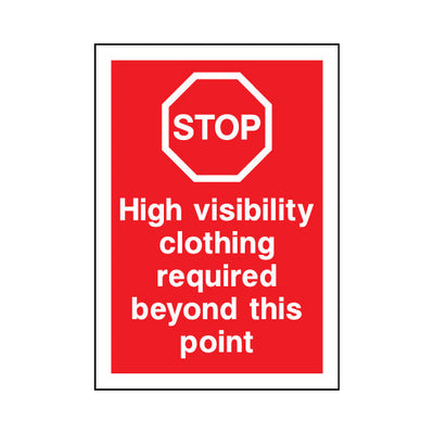 The Stop - High Visibility Clothing Required Beyond This Point sign falls under the Protective Clothing category. This sign is commonly used in various settings, including workplaces, schools, and public spaces, to enhance safety and compliance. This sign complies with UK health and safety stand