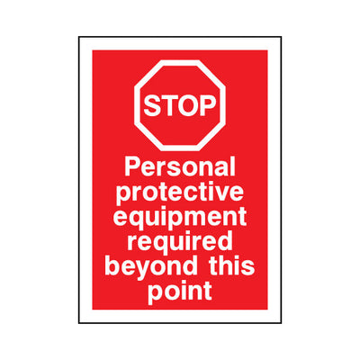 The Stop - Personal Protective Equipment Required Beyond This Point sign falls under the Protective Clothing category. This sign is commonly used in various settings, including workplaces, schools, and public spaces, to enhance safety and compliance. This sign complies with UK health and safety