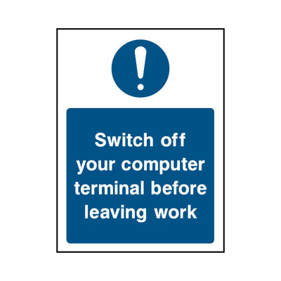 The Switch Off Your Computer Terminal Before Leaving Work sign falls under the Machinery & General category. This sign is commonly used in various settings, including workplaces, schools, and public spaces, to enhance safety and compliance. This sign complies with UK health and safety standa