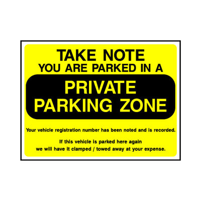 The Take Note - You Are Parked In A Private Parking Zone sign falls under the Parking category. This sign is commonly used in various settings, including workplaces, schools, and public spaces, to enhance safety and compliance. This sign complies with UK health and safety standards, including BS