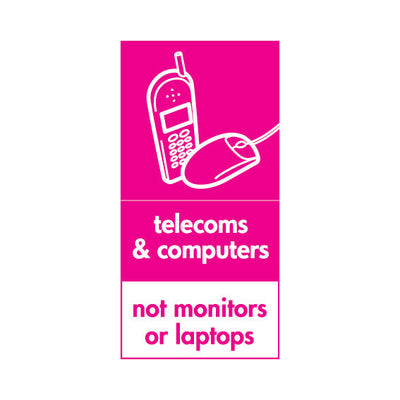 The Telecoms & Computers Disposal - Not Monitors Or Laptops V1 sign falls under the Electrical Recycling category. This sign is commonly used in various settings, including workplaces, schools, and public spaces, to enhance safety and compliance. This sign complies with UK health and safety