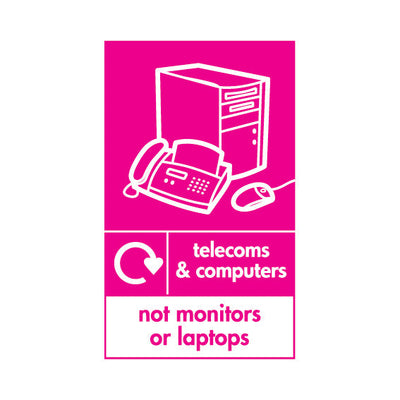 The Telecoms & Computers Recycling Icon - Not Monitors Or Laptops V2 sign falls under the Electrical Recycling category. This sign is commonly used in various settings, including workplaces, schools, and public spaces, to enhance safety and compliance. This sign complies with UK health and s