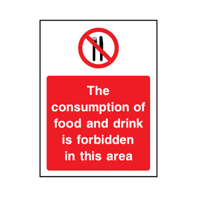 The The Consumption Of Food And Drink Is Forbidden In This Area sign falls under the General Prohibition category. This sign is commonly used in various settings, including workplaces, schools, and public spaces, to enhance safety and compliance. This sign complies with UK health and safety stan