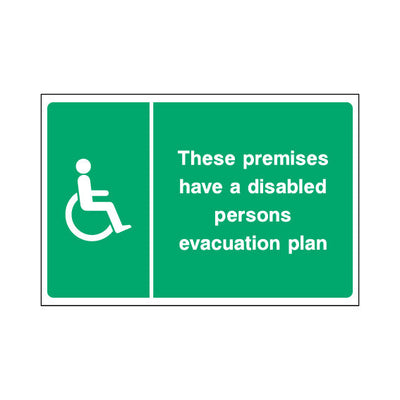 The These Premises Have A Disabled Persons Evacuation Plan sign falls under the Emergency Escape category. This sign is commonly used in various settings, including workplaces, schools, and public spaces, to enhance safety and compliance. This sign complies with UK health and safety standards, i