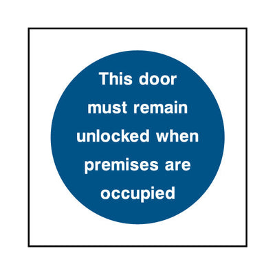 The This Door Must Remain Unlocked When Premises Are Occupied sign falls under the Fire Prevention category. This sign is commonly used in various settings, including workplaces, schools, and public spaces, to enhance safety and compliance. This sign complies with UK health and safety standards,