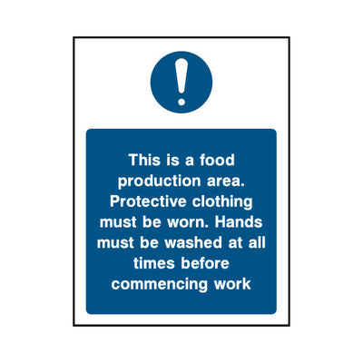 The This Is A Food Production Area. Protective Clothing Must Be Worn. sign falls under the Food Processing & Hygeine category. Used in construction sites, laboratories, and manufacturing facilities to ensure compliance with PPE regulations and protect workers from hazards. This sign complies