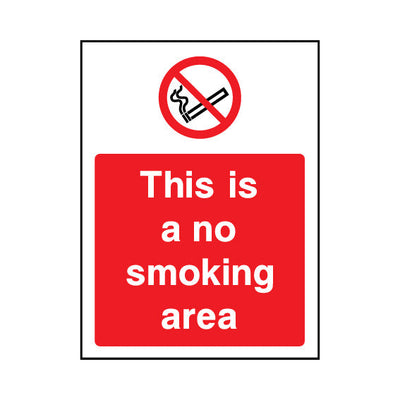 The This Is A No Smoking Area sign falls under the Smoking Prohibition category. Essential for hospitals, schools, and public spaces to enforce smoke-free policies and comply with the Health Act 2006. This sign complies with UK health and safety standards, including BS ISO 7010, ensuring that it