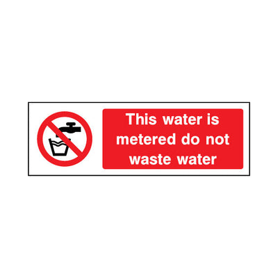 The This Water Is Metered Do Not Waste Water sign falls under the General Prohibition category. This sign is commonly used in various settings, including workplaces, schools, and public spaces, to enhance safety and compliance. This sign complies with UK health and safety standards, including BS