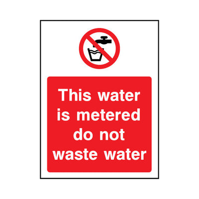 The This Water Is Metered Do Not Waste Water sign falls under the General Prohibition category. This sign is commonly used in various settings, including workplaces, schools, and public spaces, to enhance safety and compliance. This sign complies with UK health and safety standards, including BS