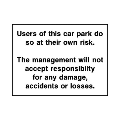 The Users Of This Car Park Do So At Their Own Risk sign falls under the Hotel Signs category. This sign is commonly used in various settings, including workplaces, schools, and public spaces, to enhance safety and compliance. This sign complies with UK health and safety standards, including BS I