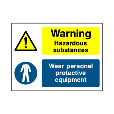 The Warning Hazardous Substances - Wear PPE sign falls under the Protective Clothing category. This sign is commonly used in various settings, including workplaces, schools, and public spaces, to enhance safety and compliance. This sign complies with UK health and safety standards, including BS