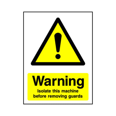The Warning - Isolate This Machine Before Removing Guards sign falls under the Machinery Warning category. This sign is commonly used in various settings, including workplaces, schools, and public spaces, to enhance safety and compliance. This sign complies with UK health and safety standards, i