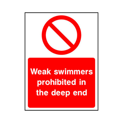 The Weak Swimmers Prohibited In The Deep End sign falls under the Water Safety category. This sign is commonly used in various settings, including workplaces, schools, and public spaces, to enhance safety and compliance. This sign complies with UK health and safety standards, including BS ISO 7010, ensuring that it meets legal requirements for safety signage. By displaying this sign, you contribute to creating a safer environment while adhering to regulations. At One Printer, we make it easy to order the exact product you need. You can select from a range of materials and finishing options to suit your specific requirements. Our available materials include 1mm PVC, 3mm Foamex, 3mm Dibond, self-adhesive vinyl, anti-slip floor graphics, and removable magnetic. Finishing options include 3M double-sided tape or drill holes for easy installation. With One Printer, you can be confident that your signage meets the highest standards of safety, durability, and customisation, all backed by our expert customer support team. H&S Sign Product Code: WS017.