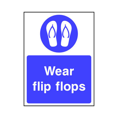 The Wear Flip Flops sign falls under the Water Safety category. This sign is commonly used in various settings, including workplaces, schools, and public spaces, to enhance safety and compliance. This sign complies with UK health and safety standards, including BS ISO 7010, ensuring that it meet