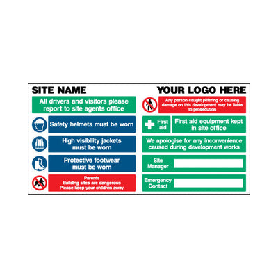 The Your Logo Here & Site Name - Main Entrance Site Landscape sign falls under the Construction category. This sign is commonly used in various settings, including workplaces, schools, and public spaces, to enhance safety and compliance. This sign complies with UK health and safety standards, including BS ISO 7010, ensuring that it meets legal requirements for safety signage. By displaying this sign, you contribute to creating a safer environment while adhering to regulations. At One Printer, we make it easy to order the exact product you need. You can select from a range of materials and finishing options to suit your specific requirements. Our available materials include 1mm PVC, 3mm Foamex, 3mm Dibond, self-adhesive vinyl, anti-slip floor graphics, and removable magnetic. Finishing options include 3M double-sided tape or drill holes for easy installation. With One Printer, you can be confident that your signage meets the highest standards of safety, durability, and customisation, all backed by our expert customer support team. H&S Sign Product Code: CN123.